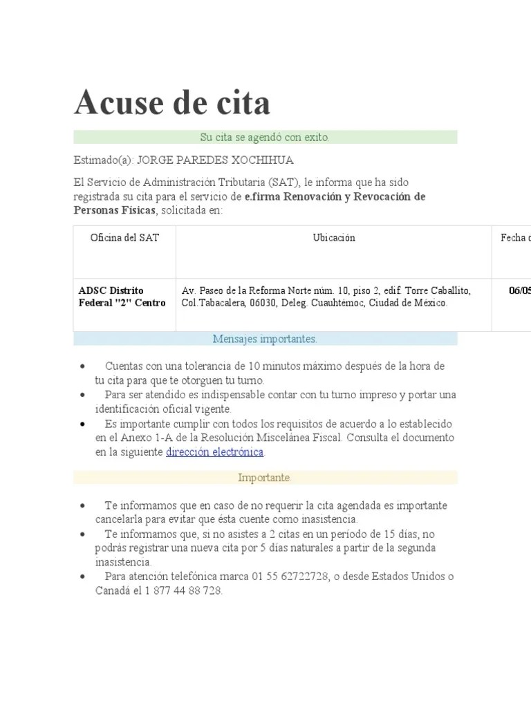 Acuse De Cita Sat Pdf : Sacar Cita Tramita Tu Cita De Manera Automatizada : En la pantalla se visualizará el folio de tu solicitud, así como información importante.